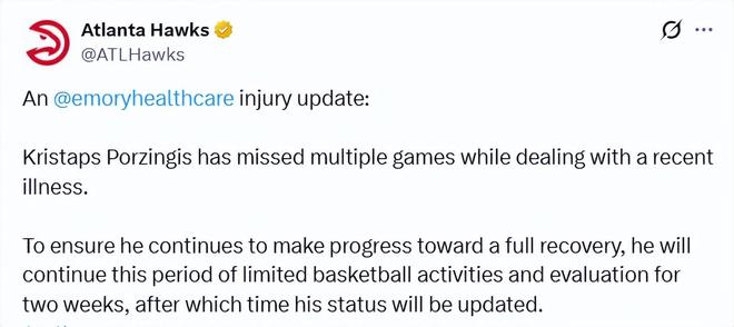 北京時間12月15日,名記Shams報道稱,消息源透露,亞特蘭大老鷹隊球星波爾津吉斯因病將缺陣未來兩周,並接受進一步檢查評估。波爾津吉斯在過去8場比賽中已缺席7場,目前球員與球隊均將其本賽季的長期健康置於首位。