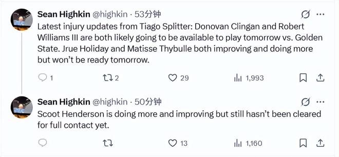 北京時間12月14日,據開拓者隊記Highkin報道,主帥斯普利特更新了球隊的傷情:克林根與羅威大概率可出戰明日對陣勇士隊的比賽。朱-霍勒迪、賽布爾的傷情均有所好轉,訓練參與度也逐步提升,但明日暫無法登場。亨德森的恢複情況正持續向好,訓練量也在增加,不過目前仍未獲準參與全對抗訓練。